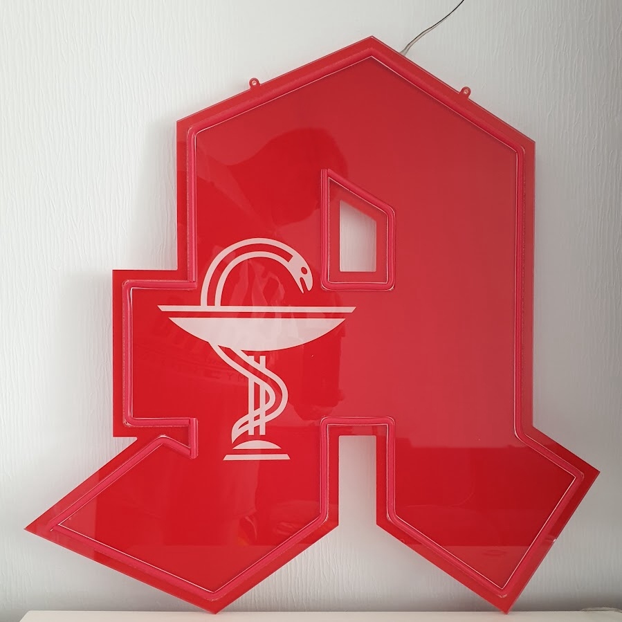 Das leuchtende Apotheken-A ist ab sofort lieferbar. Die sehr stabile 7mm dicke Acrylglas Trägerplatte ist rot und der eingezeichnete Arzneikelch mit Schlange ist per UV Druck eingearbeitet. Die Kontur des gotischen "A" leuchtet Rot im eingeschalteten Zustand und ist somit abends und nachts sehr weit sichtbar. Das Leuchtschild entspricht in Farbe und Bauart den Anforderungen des ABDA.