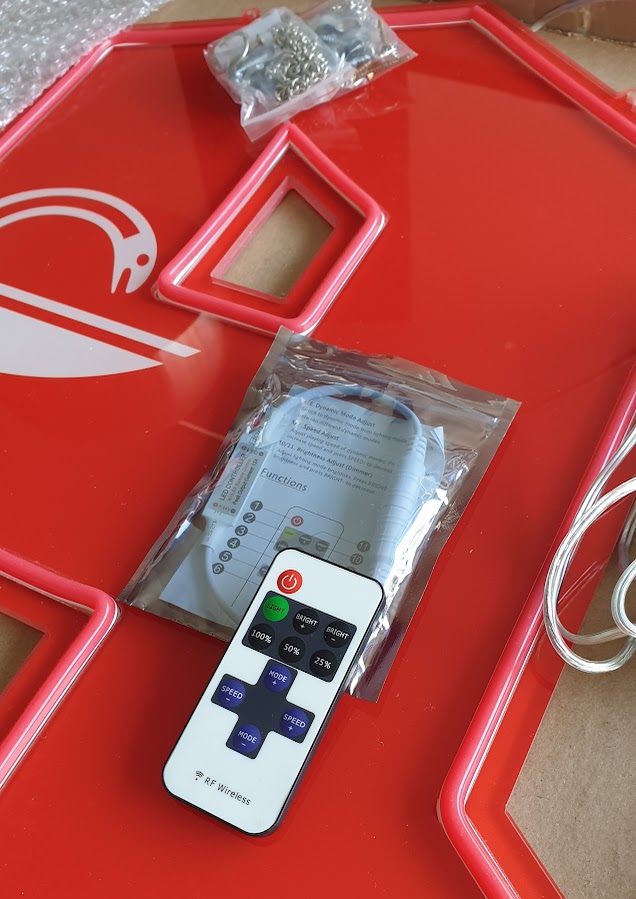 Die Lieferung erfolgt komplett mit Aufhängung, Trafo 220V / 12V sowie ein Infrarot Zwischenstück für die Ansteuerung per Fernbedienung. Das Leuchtschild lässt sich so in Leuchtkraft und Effekten (blinken, verschiedene Helligkeit) steuern sowie ein- und ausschalten.