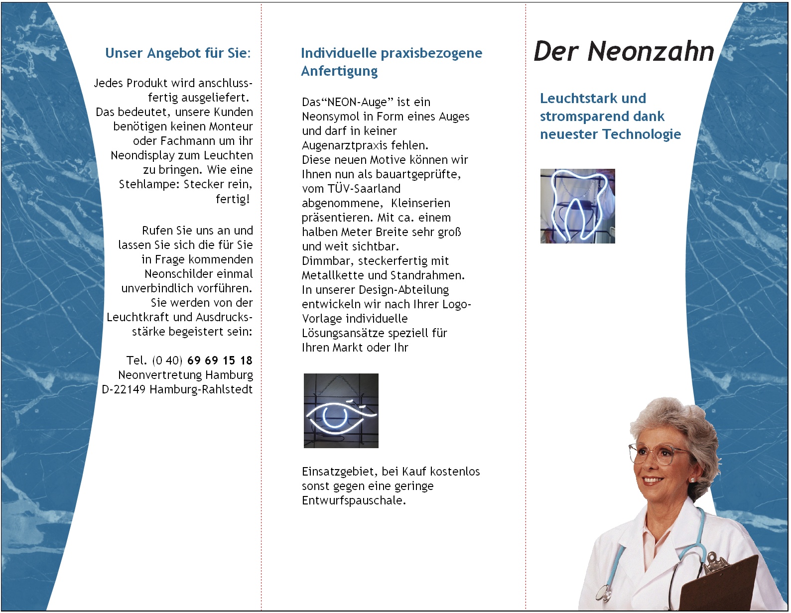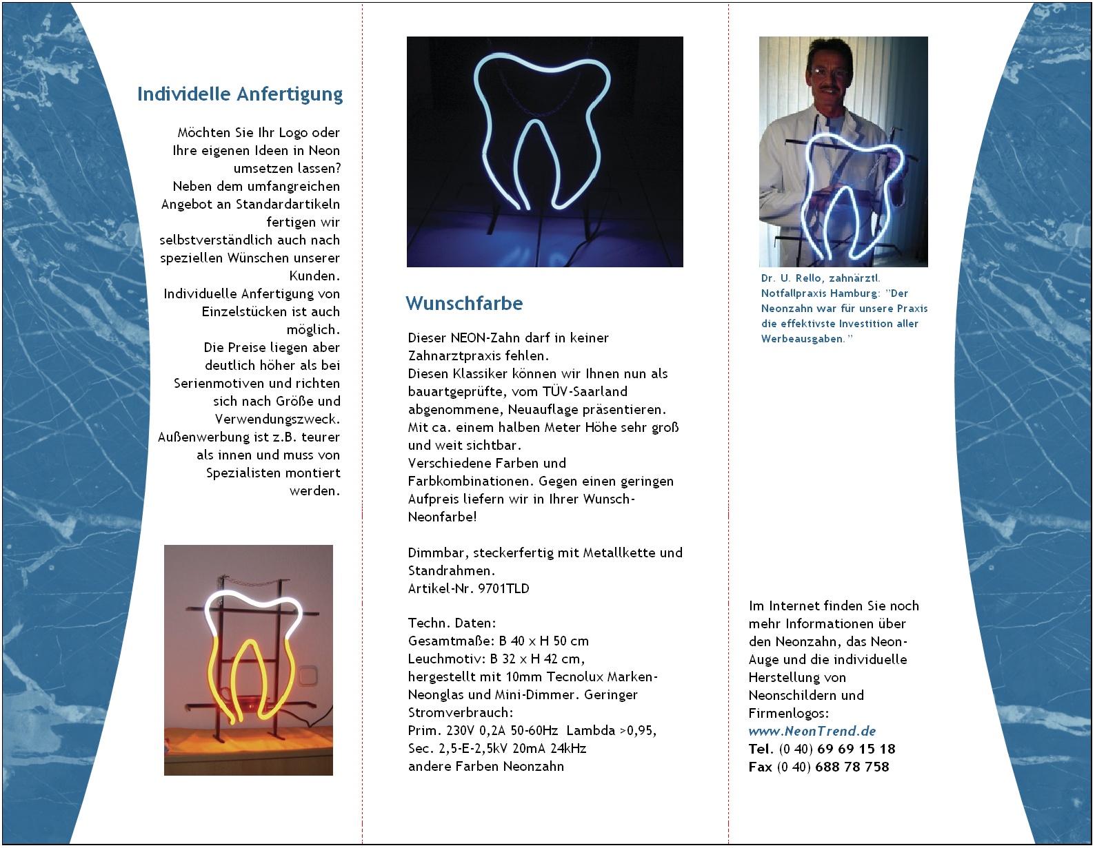 Gern stellen wir Ihr Logo oder eine leuchtende Notdienst Telefonnummer speziell für Ihre Zahnarztpraxis oder Dentallabor her.