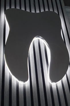Diese Leuchtzähne sind speziell für Innenräume konzipiert zur Montage an glatten Wänden, zum Beispiel im Empfangsbereich einer Zahnarztpraxis oder im Warteraum.